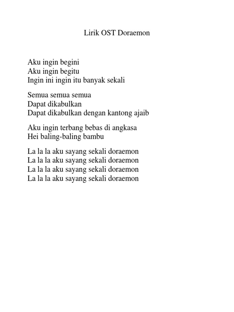. Namun pada versi orisinalnya di Jepang lagu pembuka tersebut diberi judul Doraemon no Uta dan dibawakan oleh Komiko Osugi. Lirik Lagu Opening Kartun Doraemon Indo ver Aku ingin begini Aku ingin begitu Ingin ini itu banyak sekali Semua semua semua Dapat dikabulkan Dapat dikabulkan Dengan kantong ajaib Aku ingin terbang bebas Di angkasa Hei. Aku ingin banyak banyak banyak sekali.